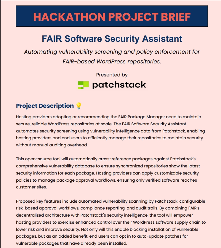Carole Olinger (Head of CloudFest Hackathon) announced that the participants developed a proof of concept during the hackathon that adds real-time security warnings to software packages. It transforms vulnerability data into standardized labels shown during installation and includes a policy engine that allows hosting providers to enforce security measures at the infrastructure level. By combining FAIR’s decentralized package delivery with Patchstack’s threat intelligence, the project helps identify threats before installation rather than after deployment.